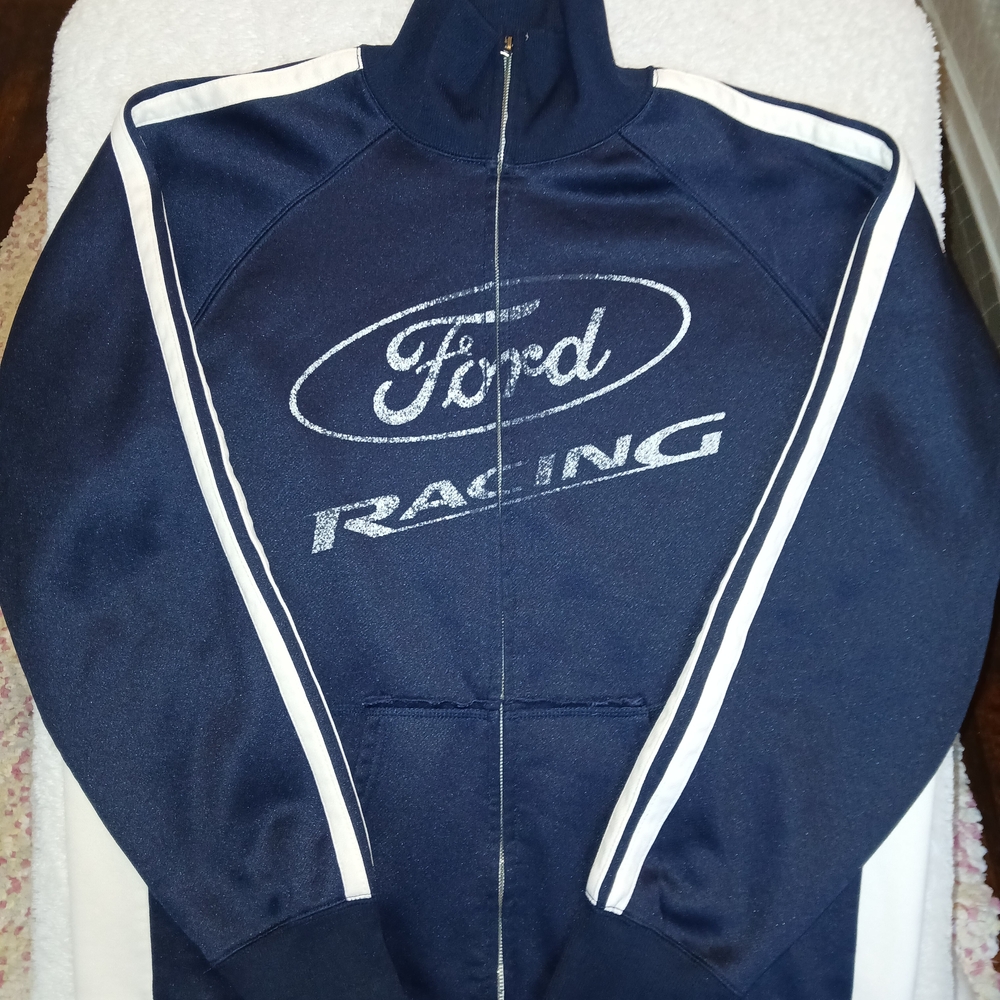 Navy jacket with Ford Racing logo. Features white stripes on sleeves. the jacket is in perfect shape. the letters are cracking but it gives the jacket a lot of character.