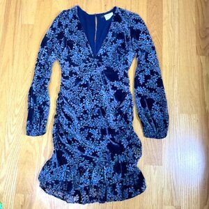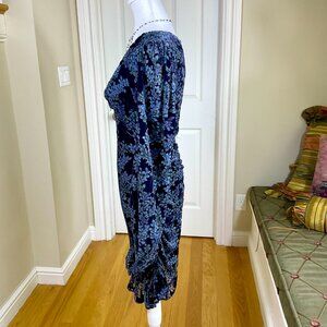 Really beautiful velvet textured floral burnout dress, deep V-neck, long sleeves, ruching, ruffles, Blue multi, back zip and one covered button