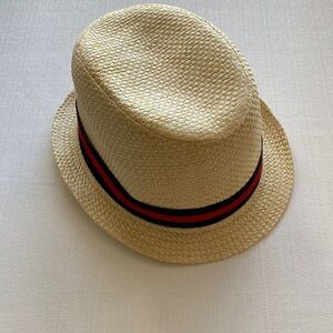 Woven Tan with Red and Navy Ribbon Trim