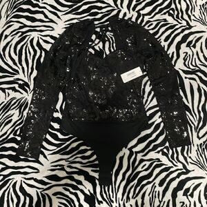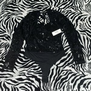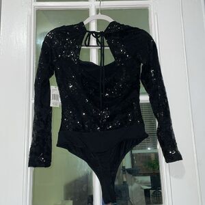 Fore black sequins sweetheart long sleeve bodysuit Onsie open keyhole tie back