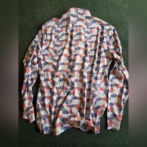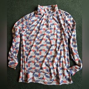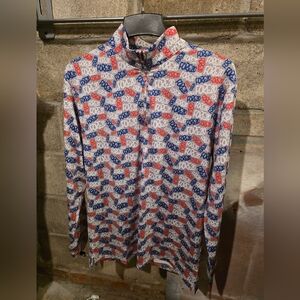 Vibrant long sleeve top with a quarter-zip design. Features a colorful pattern with red, blue, and white accents by online retailers Fore20 Golf