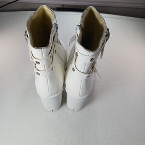 Keywords: white ankle boots, lace up boots, block heel boots, lug sole boots, buckle strap boots, womens fashion boots, combat boots, platform boots, winter boots, casual boots, stylish ankle boots, white heeled boots