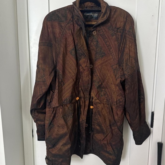 Stylish brown patterned jacket by Forecaster. Features a unique design with button details.