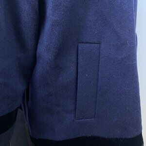 This Forecaster women's hooded coat blends style with warmth. Crafted from a soft wool blend, it features a navy body complemented by black velvet trim accents. The button closure at the collar adds sophistication, while its fully lined interior enhances comfort. The medium-length design ensures coverage and elegance. No flaws or defects for a clean, polished look.