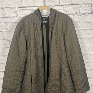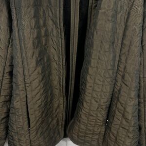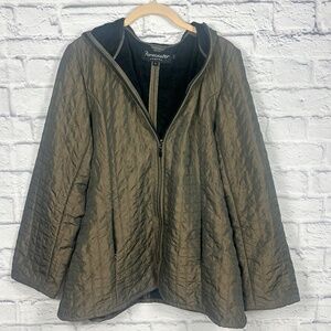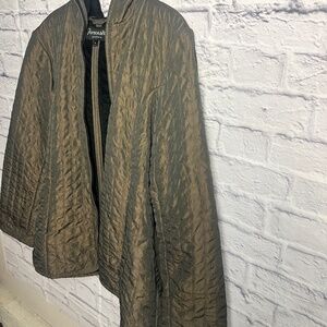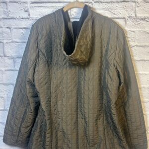 Beautiful quilted A-line jacket featuring a soft olive base with a subtle bronze/brown iridescent sheen that catches the light and gives the fabric a rich, elevated look. Full zip front, cozy hood, and zip pockets. Slight swing silhouette makes it easy to layer and super flattering. Lightweight to mid-weight — perfect for fall and winter.