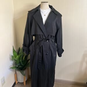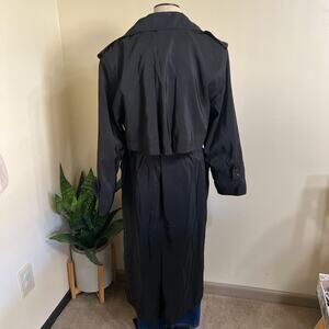 Classic and elegant trench coat by Forecaster of Boston. Features a black color with stylish polka-dot lining and a removable waist belt for a flattering silhouette.
