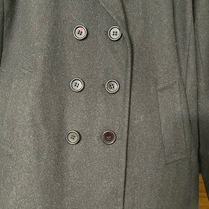 Forcaster of Boston women’s charcoal gray Doubel-Breasted pea coat size 16 it made of 52% wool 34% polyester 9% Acrylic. It has two side pockets fixed belt at the back  mid length pit to pit 23.5” length 32.5” shoulder to shoulder 17 3/4” sleeve 25.5” pre owned good condition