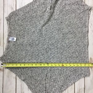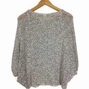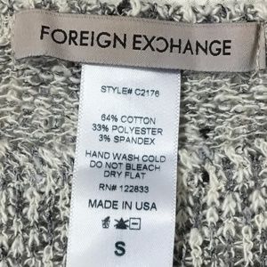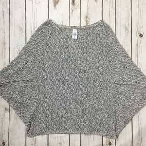 Heathered gray lightweight knitted sweater or top by Foreign Exchange. I don’t know the exact style name but it reminds me of a bat wing top. Made in USA. 64% cotton, 33% polyester and 3% spandex. Size S but generous cut. Difficult to measure due to the cut. About 16 inches across the chest and 23 inches in length. A real fun piece! B8