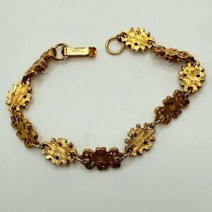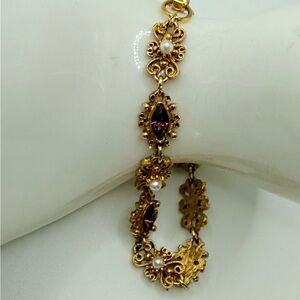 Gold bracelet with deep purple stones. Elegant design with pearl accents. Perfect for any occasion.