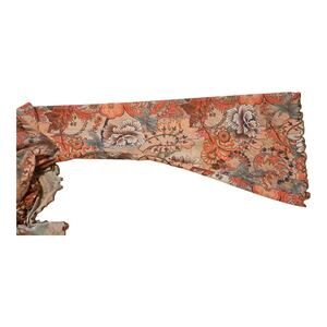 Boho-inspired sheer floral blouse in a warm palette of burnt orange, taupe, and muted sage with romantic ivory florals throughout. Designed with long dramatic bell sleeves, a plunging V-neckline, and a front tie detail that cinches the waist for a flattering silhouette. The lightweight, semi-sheer fabric drapes beautifully and features a ruffled lettuce hem for added movement and texture. Effortlessly pairs with denim, skirts, or layered over bralettes and camis for a versatile statement look. Perfect for festival wear, concerts, or adding a bold vintage-inspired touch to everyday outfits. In excellent preowned condition.