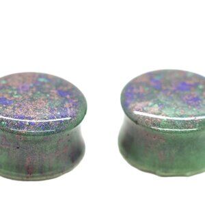 These handcrafted gauges are molded from frosted forest green resin and accented with glitter in shades of bronze, dark blue, and hints of bright green across the front. The result is a rich, earthy shimmer that catches the light beautifully while maintaining a subtle, natural tone.