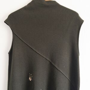 Green midi sweater dress with gold floral embroidery. Asymmetrical in every way with the hemline, neckline, and sleeves. The neckline is like a high slouchy neck and is longer on one side. Embroidery is both flat and the larger flowers are 3D.