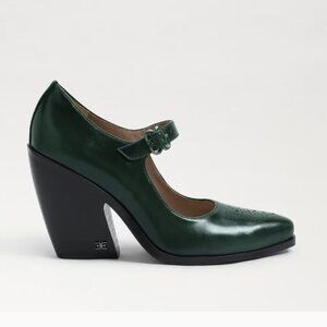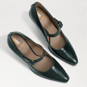 Chic and versatile, these Mary Jane–style pumps feature a rich forest green leather finish with a glossy sheen. Designed with a modern pointed toe, perforated detailing, and a signature clover-shaped buckle strap, they strike the perfect balance of vintage-inspired charm and everyday sophistication. The chunky black block heel provides comfort and stability while elevating your style.