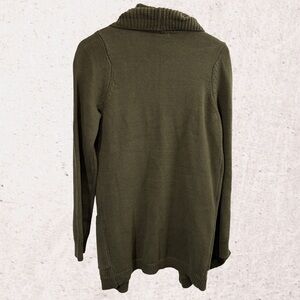 This forest green cardigan features a shawl collar and an open front design, perfect for layering in cooler weather. Made from a medium to heavy knit fabric, it offers a relaxed fit that drapes elegantly past the hips. The textured knit adds a touch of sophistication to this versatile piece.