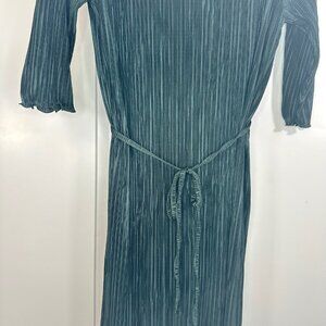 Stretchy pleated dress with pearl merrowed edges. A self-tie belt is included. Unlined. Perfect for all seasons. Semi-metallic finish.