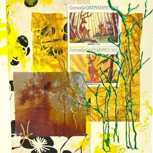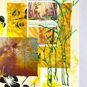 This unique art piece features collaged papers, including several vintage Grenada Disney Bambi postage stamps, moody trees image transfer, flashy green mirror leaf tree accents and is painted on stiff fine art paper board.