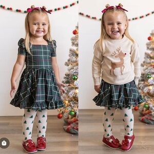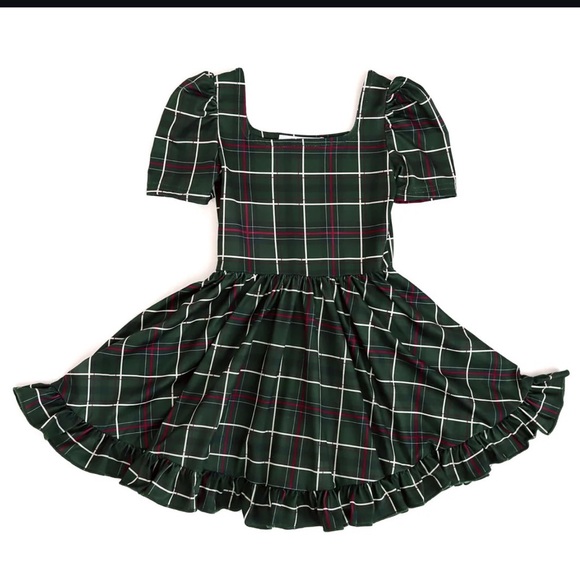 Charming plaid dress featuring a green base with red and white accents. Square neckline and ruffle hem add a playful touch.