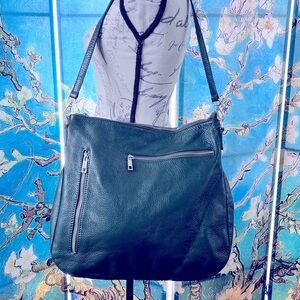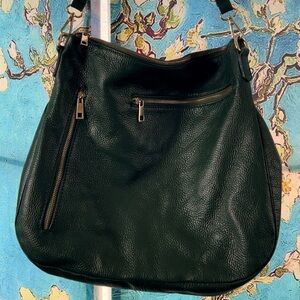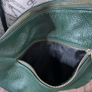 This soft, genuine leather, forest green, Borse In Pelle purse has a zipper closure with gold hardware. There are two zipper pockets in the front and three pockets inside the bag. It comes with two different sized straps. One is 18 inches long the other is 40 inches long. Practically brand new made in Italy.