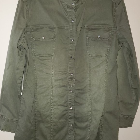 Diane Gilman (DG2) forest green tunic style, button down, long sleeve, denim material, epeletes at shoulders, jewel style buttons. Cotton/spandex. Machine wash, hang dry. New, never worn. Washed once.