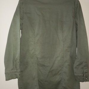 Forest green button down denim material tunic shirt, long sleeve, size small