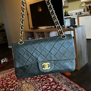Vintage, lambskin. Rare green color. Scratches, plating wear, corner wear. With COA and box.