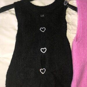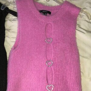 Super cute pair of trendy sparkly rhinestone heart button keyhole cutout sweater vests in azalea pink and black from Forever 21.Have only wore both sweater vest tops only once. Great for all seasons, fall, spring, summer, and winter. The azalea pink sweater top is sold out on their site! Each retails for $25.