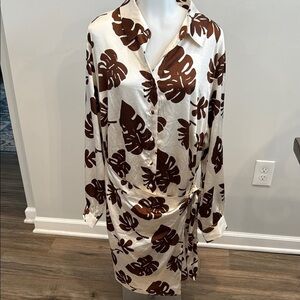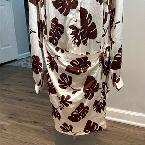 Stylish dress with a brown leaf print on a white background. Features a button-up front and a tie waist.