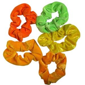 5-piece bundle of Neon Velvet Scrunchies from Forever 21! These soft, plush hair ties come in a brilliant gradient of fluorescent colors: Lime Green, Bright Yellow, Bright Orange, and Tangerine.