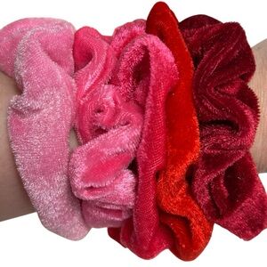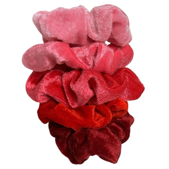 New F21 velvet-like scrunchies! Set of 5 soft, plush hair ties in shades of pink, red, and burgundy. New without tags. Perfect for ponytails & buns. Retro Y2K style.