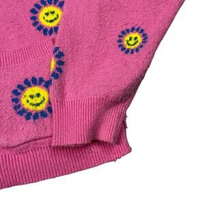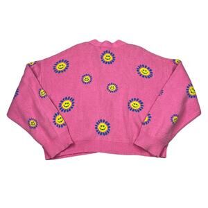 Forever 21 AOP Happy Face Floral V-Neck Cropped Cardigan Sweater FLAW Pink Large