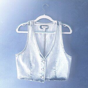 Stylish denim tank with button-up front. Cropped, sleeveless design. Acid wash denim. Great versatile summer ☀️ top. A woven vest featuring an allover bleach wash, button-front closures, princess seams, a V-neckline, and cropped hem.
