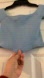 Size OS (one size). Baby blue in color. Super stretchy crop top. Short sleeves. Knit fabric. Reminds me of the popcorn tops from the 2000’s.
