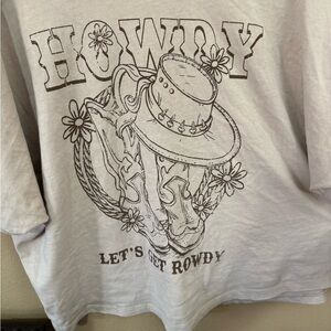 Stylish graphic tee with bold lettering “Howdy Let’s Get Rowdy”. Ideal for casual outings.