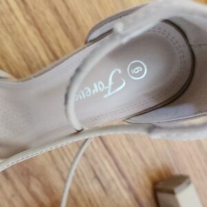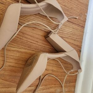 Stylish beige heels with pointed toe. Features elegant ankle strap. Ideal for versatile wear.
