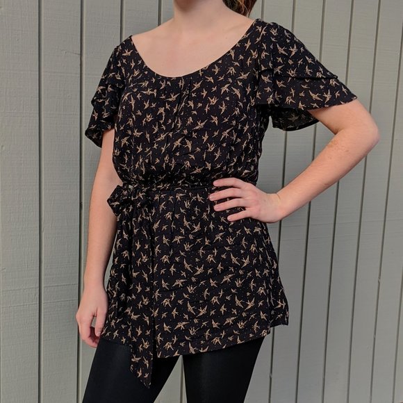 Forever 21 long, tunic-style top with flutter sleeves and elastic gathered waist with tie.