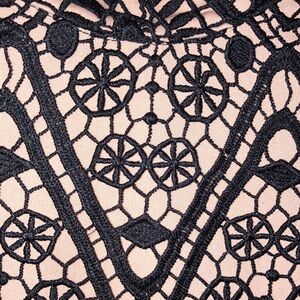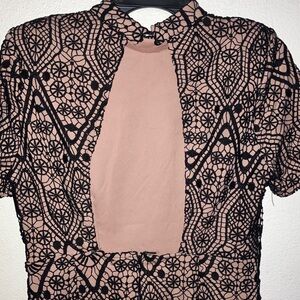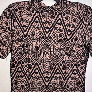 Chic mini dress with black lace pattern. Soft nude underlay. Perfect for a night out. Preowned.
