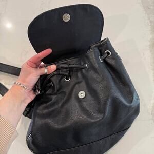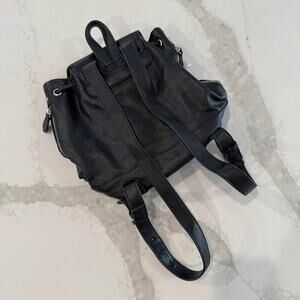 Forever 21 Black Faux Leather Drawstring Backpack Purse Silver Accent w/ Tassel & Adjustable Straps