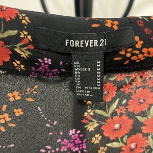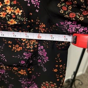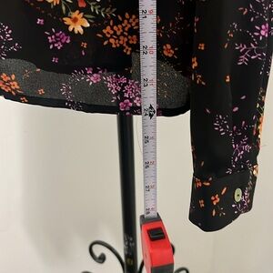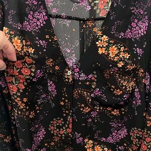 Chic black blouse with colorful floral design. Sheer fabric. Ideal for stylish outings.