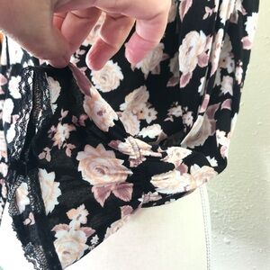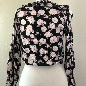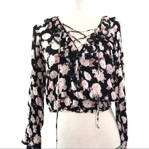 Forever 21 Black Floral Crop Top with Pink Roses, with Ruffle at neck - lace edged and lace up at chest , long sleeved with lace edging and elastic at wrist Peasant blouse