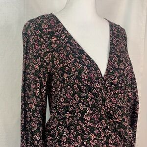 Adorable, lightweight long sleeved romper. Black backing with delicate pink floral design. Generous v neck with draped look, snap button closure at the bust assists in sliding this piece on and off. Great spring and summer garment that is sweet and causal. 100% Rayon, hand wash.