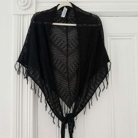 Elegant black knit scarf wrap. Features fringe detailing. Perfect for layering. Yearn has a little shimmer to make you sparkle.