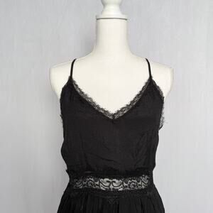 romantic black lace maxi dress by Forever 21 featuring a flattering fit & flare silhouette, tiered skirt, and delicate lace trim along the neckline and waist. includes adjustable cami straps, side slit, and full lining for comfortable wear.