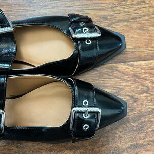 These sleek black patent flats from Forever 21 bring edgy sophistication to any outfit. Designed with a modern pointed toe, adjustable straps, and bold silver buckle details — they’re the perfect blend of chic and cool-girl street style.