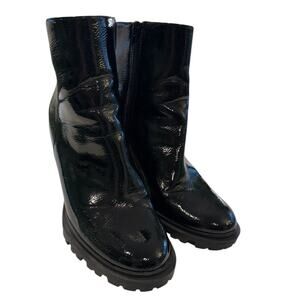 Forever 21 boots, black patent ankle boots, chunky heel booties, goth grunge shoes, edgy fashion boots, street style footwear, Y2K platform ankle boots, shiny patent boot, faux leather zip boots, trendy fall boots