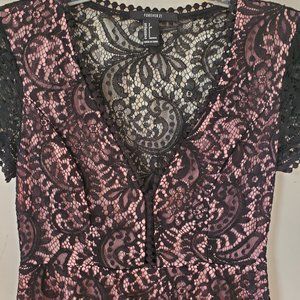 Beautiful lace dress with a floral pattern in size small. The dress is black with a pink slip underneath. The slip is attached to the dress. There is a side zipper on one side of the dress. Knee length and the bottom is very flowy. The top part is more fitted. The front has a v neck shape. This dress is from Forever 21 and is in excellent condition. This dress is preowned but was only worn one time. Like New! This is coming from a smoke free home.