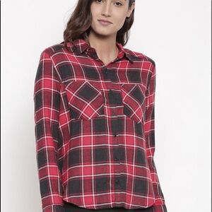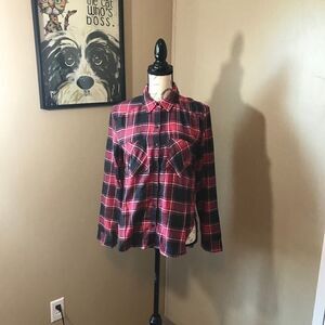 Forever 21 flannel shirt in red and black. Women's size Small/Petite. Long sleeves with button-up closure. Made of 64% rayon and 36% polyester.