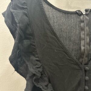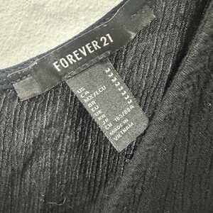 This elegant black blouse from Forever 21 features charming ruffled details and a buttoned front, offering a sophisticated touch to any outfit. The blouse's lightweight fabric and stylish design make it a versatile choice for both casual and formal occasions.