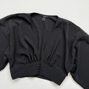 Forever 21 Black Satin V-Neck Balloon Sleeve Crop Top, Size Medium