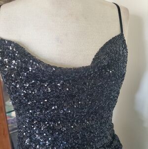 Step into the spotlight with this stunning black bodycon dress from Forever 21, featuring a dazzling sequin design. The sleeveless, spaghetti strap neckline adds a touch of elegance, while the slit detail enhances its sophisticated silhouette. Perfect for cocktail parties or a night out, this midi dress promises to make a glamorous statement.