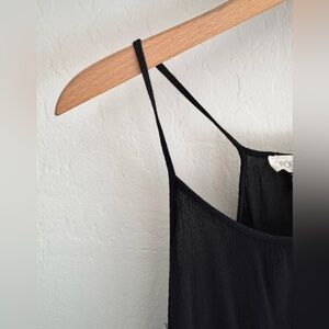 Elegant and edgy black sheer tank top from Forever 21, size Small. Features delicate spaghetti straps and a gorgeous lace hem with scalloped edges and fringe detail. Lightweight and airy—perfect for layering over a bralette or cami for a night out or festival look.